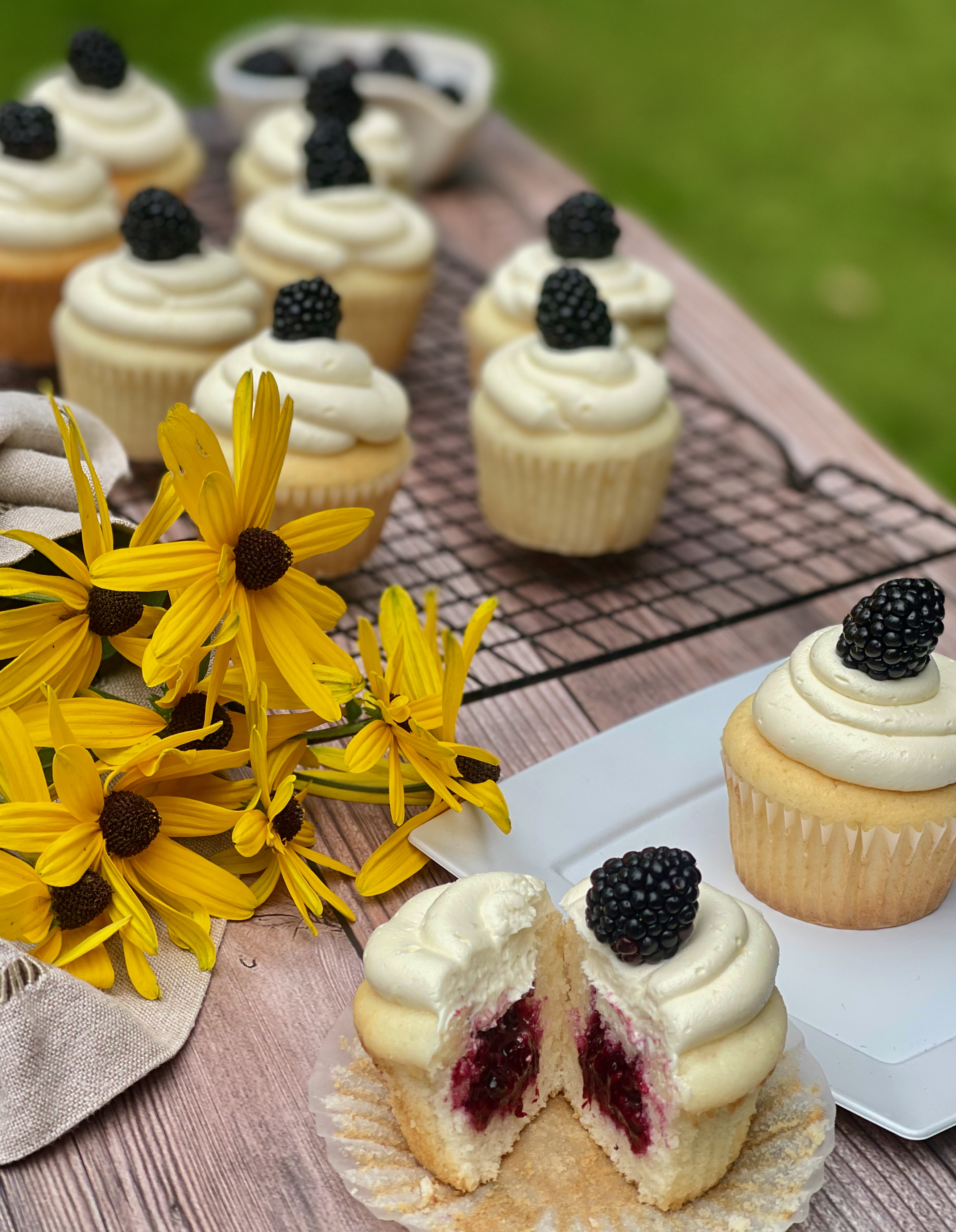 Armed of the latest books from the library, I discovered a recipe for these delicious blackberry filled vanilla cupcakes with white chocolate frosting. The author, Canadian baker Kelsey Siemens, wrote a book, The Farmer’s Daughter Bakes, in which these cupcakes are featured. I decided to adjust the recipe into a gluten-free version. The result was a light and fluffy cake topped with rich white chocolate frosting, well balanced by the tart blackberry filling.